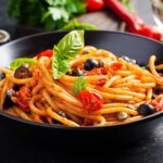 Recette de Spaghetti alla Puttanesca au Cookeo – un plat de pâtes italiennes rapide et savoureux, avec tomates, olives noires, câpres, anchois et basilic.