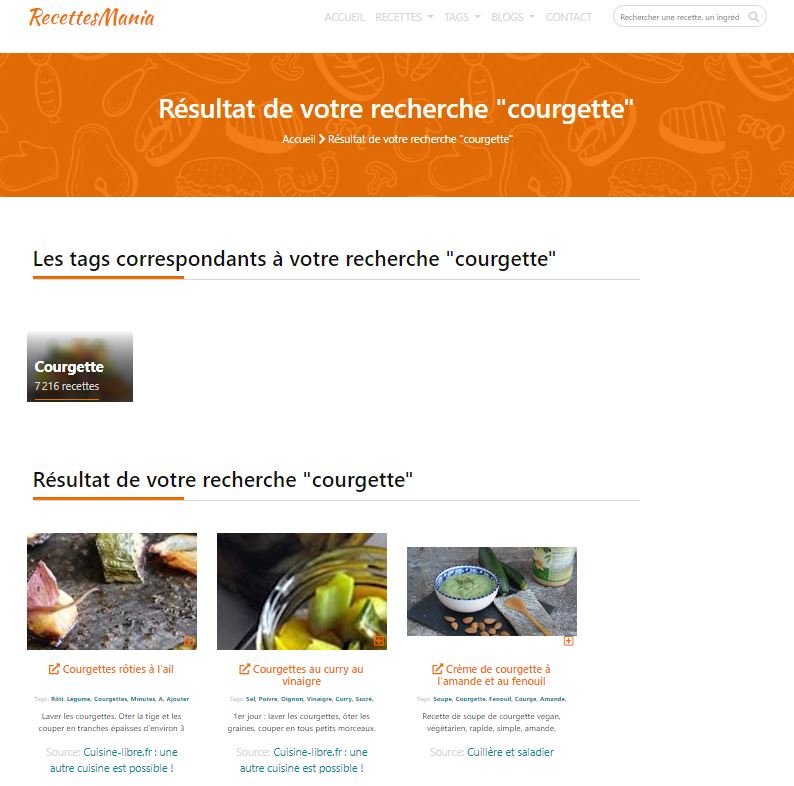 C’est là que RecettesMania entre en scène en regroupant toutes les recettes de divers blogs et sites. Donc, si vous tapez « Courgette » dans la barre de recherche, l’annuaire vous propose toutes les recettes à base de courgettes qu’il recense, tous sites et blogs confondus. Vous bénéficiez d’un aperçu rapide avec le titre, la photo et le descriptif de la recette pour vous donner une idée précise.