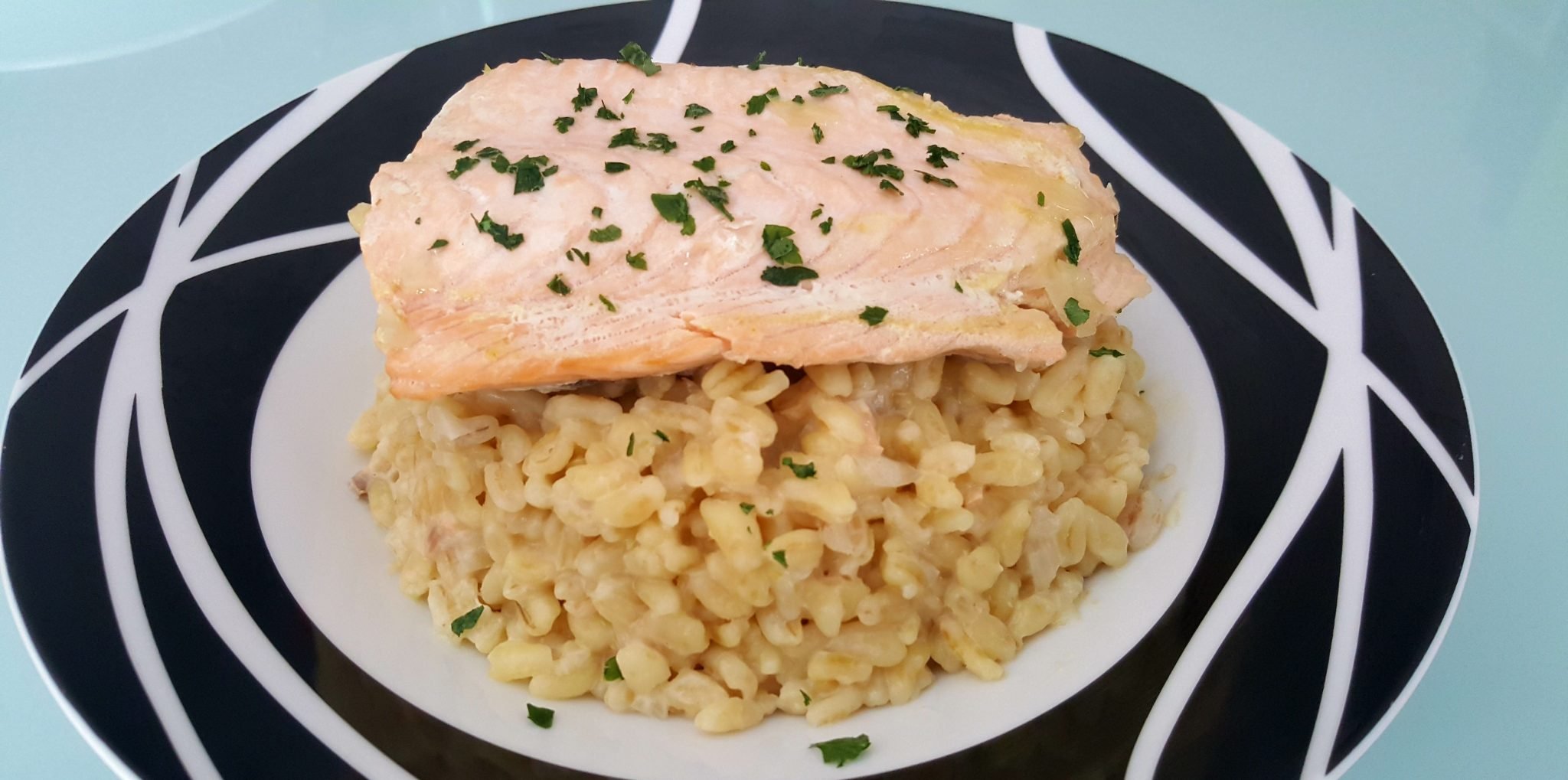 2 personnes180gr d'Ebly 2 échalotes émincées Huile d'olive 15cl de vin blanc 2 pavés de saumon 1 petit pot de crème fraîche 1 c.a.c. de Fumet de poisson Eau Sel, poivre PersilMettre le cookeo en mode dorer Faire revenir l'échalote dans un peu d'huile Ajouter le blé Laisser dorer en remuant 2min Ajouter le vin… Voir la recette
