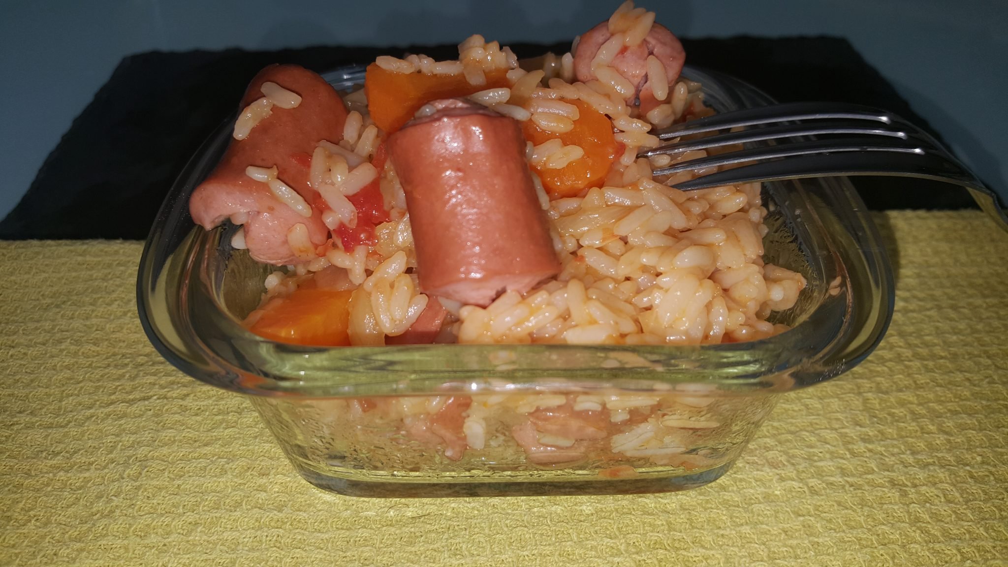 2 personnes6 chipolatas en morceaux 150g de riz 300ml de fond de veau 1 oignon émincéMettre le cookeo en mode Dorer Faire revenir les saucisses Ajouter les autres ingrédients Passer le cookeo en mode cuisson rapide 10min Voir la recette