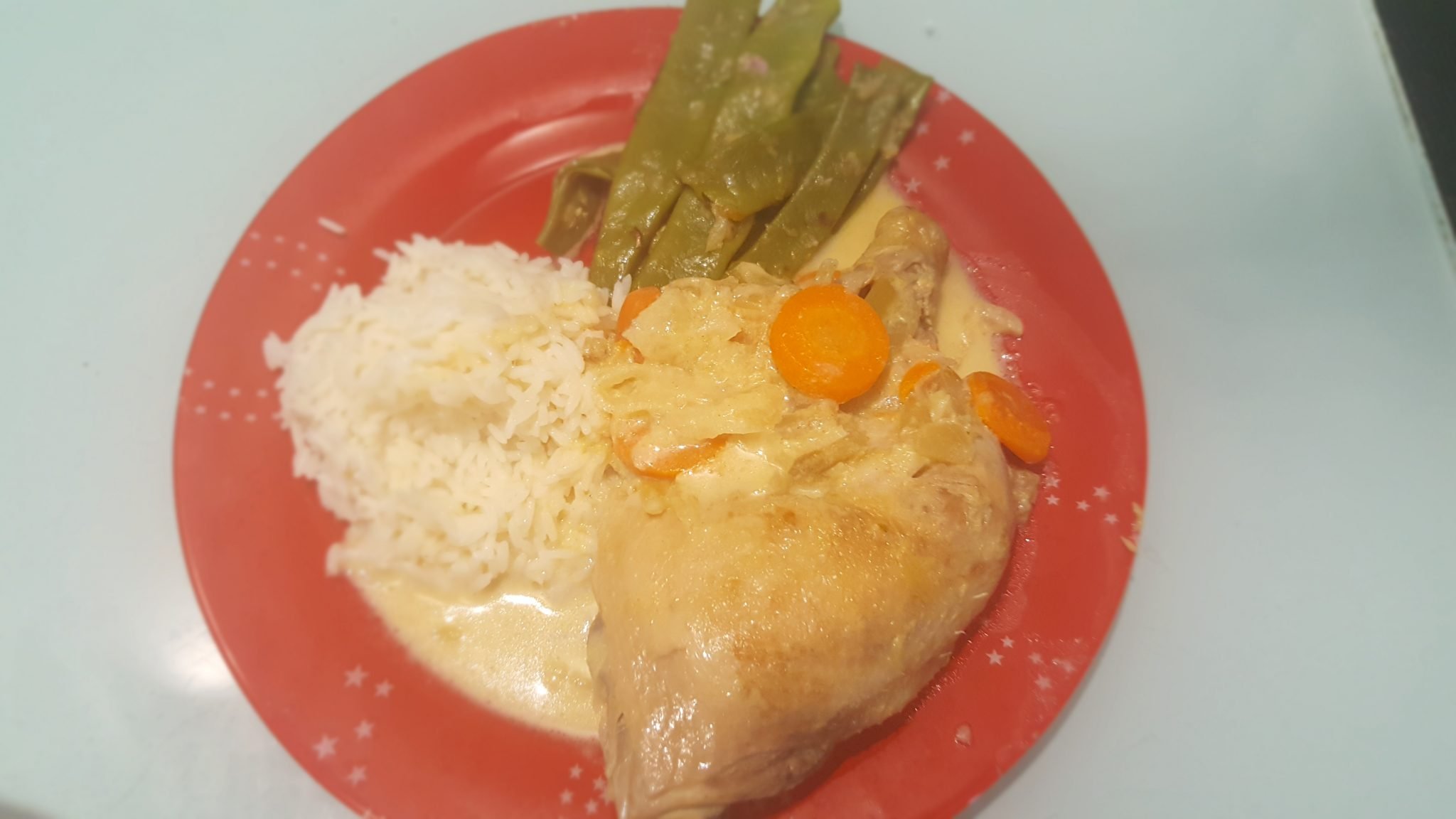 2 personnes2 cuisses de poulet 1 poignée de carottes en rondelles surgelées 1 petite boîte de salsifis 100ml de vin blanc 50ml d'eau 1 cube de bouillon de volaille 3 c.a.s. de moutarde 2 échalotes hachées 1 poignée d'oignon surgelé De la crème fraîche au choixMettre le cookeo en mode dorer Mettre les cuisses de… Voir la recette
