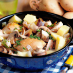 4 personnes 500gr d’escalopes de poulet 250gr de champignons entiers en boîte 400gr de pommes de terre 400gr de carottes 100gr de bacon 100ml de vin blanc 50ml d’eau 3 c.a.s. d’huile d’olive 1 bouillon de volaille en cube 1/2 oignon émincé 1 bouquet garni Sel, poivre Couper les légumes et le poulet en morceaux […]