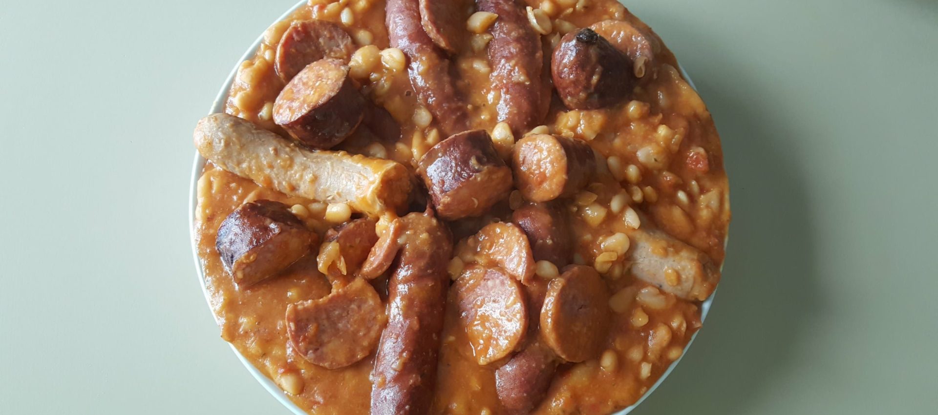 Pas mis le lard, la palette et cervelas .J ai remplacé par saucisses de Toulouse et saucisses fumées et j ai mis concassé de tomates plutôt que le concentré .