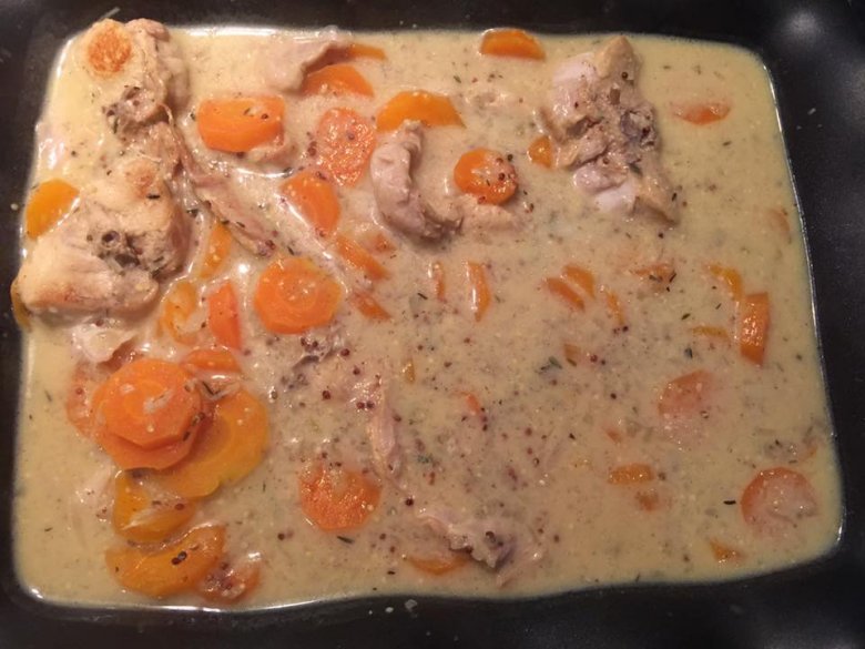 Ajouter les oignons, le vin blanc, la crème, la moutarde, le thym le vinaigre balsamique sel et poivre, puis les carottes