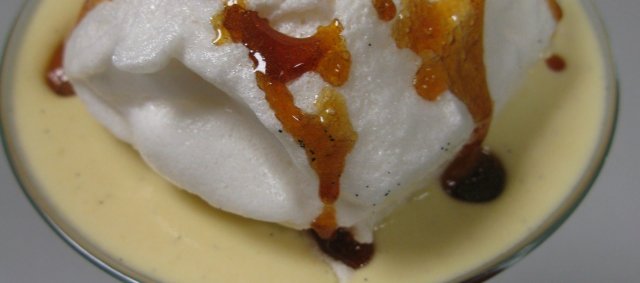A la fin de la cuisson, mettre les blancs sur la crème anglaise à l'aide d'une cuillère à soupe et napper de caramel