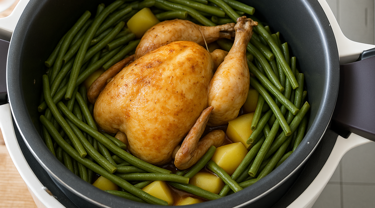 Je n’ai pas mis les tomates concassées. Poulet de 1kg900 en cuisson rapide 35′, nickel. Il faut compter 5′ pour 300g de poids de poulet. Le poulet étant gros, j’ai fait cuire ensuite les pommes de terre coupées en 2 et les haricots verts surgelés en 2ème phase de cuisson (sans le poulet), et dans le bouillon du poulet, un régal !!!!!!!!!!!! Merci.