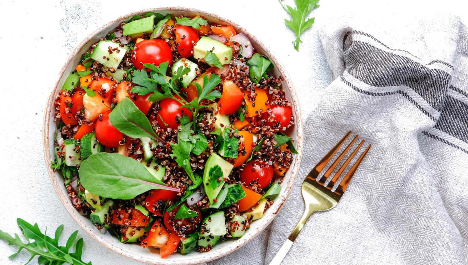 Pendant ce temps, lavez et coupez les tomates, le concombre, l'avocat et le poivron rouge en petits dés. Hachez finement le persil frais.